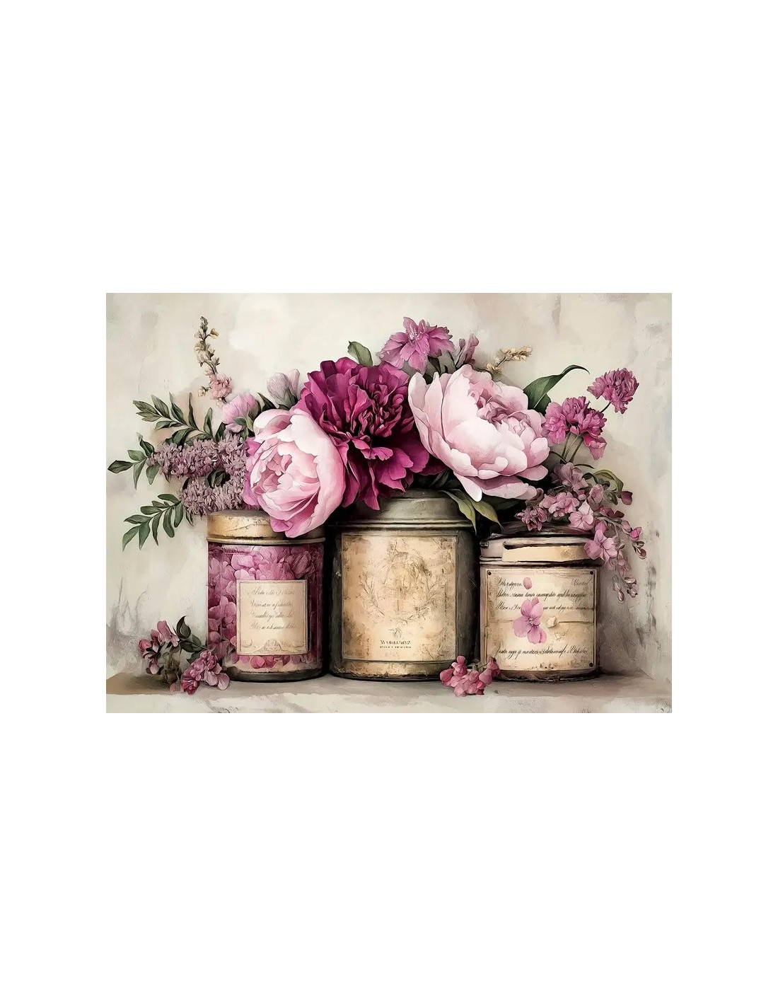 Te presentamos la lámina "El Jardín Secreto de las Latas con Historia", un nombre rimbombante para una preciosidad que te va a enamorar. Imagina: tienes un bodegón que parece sacado de un atelier francés, con unas peonías que son la envidia del vecindario y unas lilas que huelen a primavera eterna (aunque solo sea en la imaginación, que esto es papel).