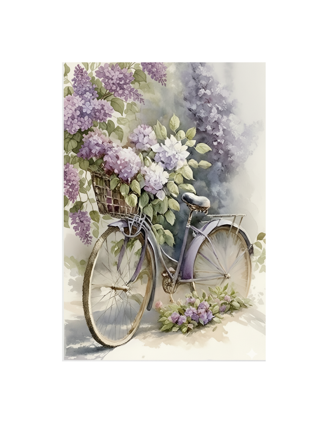 Esta lámina de papel de arroz es el upgrade que tu mueble estaba esperando. Imagina la escena: una bicicleta vintage (de esas que ahora son más decorativas que funcionales, y que tienen ese toque lavanda descolorido tan mono) que parece haber aparcado justo al lado de un muro cubierto de lilas en plena floración. ¡Y ojo! Lleva el cesto de mimbre a tope de hortensias moradas y blancas. ¡Un festín floral!