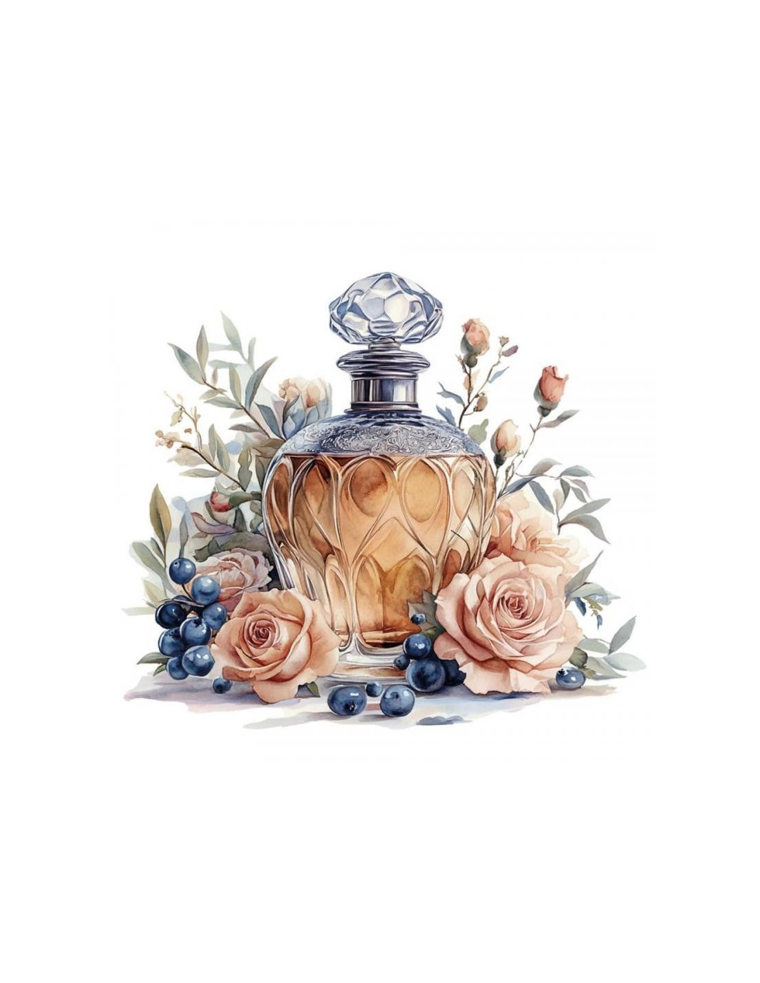 Esta lámina de transfer es una fantasía de estilo. El protagonista es un precioso frasco de perfume antiguo (¡mira ese tapón tallado como un diamante! ✨) que contiene un líquido dorado y misterioso. El frasco está elegantemente rodeado por: