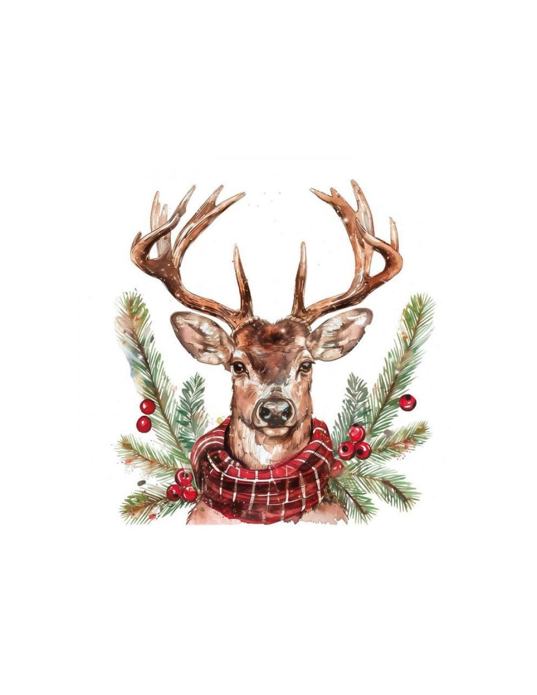 Esta lámina de transfer es una obra de arte con un estilo acuarela que resalta la belleza del protagonista: un ciervo (o reno) con una mirada profunda y una cornamenta espectacular. No es un ciervo cualquiera, ¡es un auténtico dandy! Lleva una bufanda de cuadros rojos y negros que le da un toque cálido, rústico y festivo que nos encanta. ❤️🧣