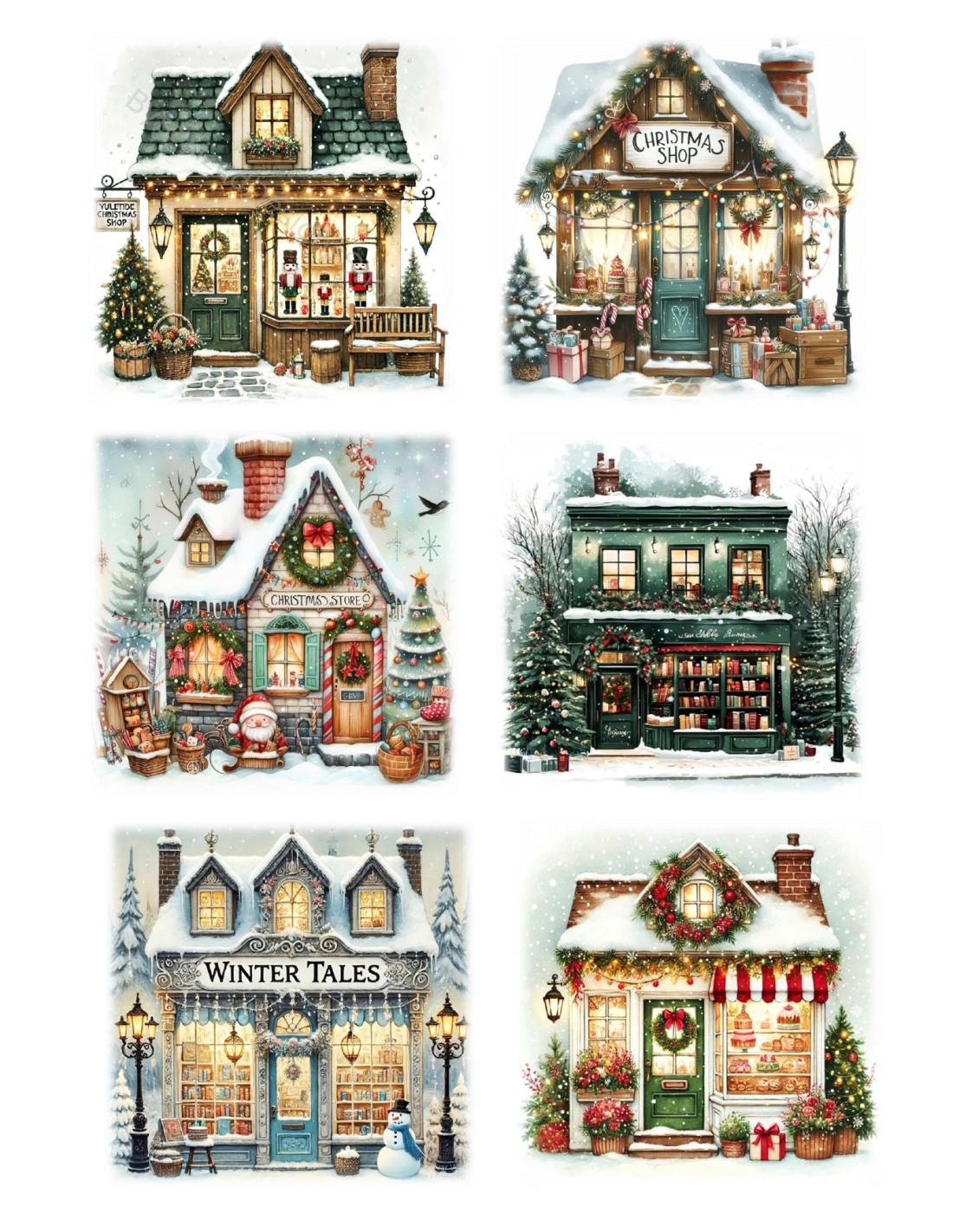 Te presentamos el Papel de Arroz Escaparates Navideños de Invierno, una lámina que es como seis mini-viajes a la Navidad perfecta. Tenemos de todo: la tienda de juguetes con cascanueces, la librería ('Winter Tales') donde seguro venden historias de amor, la pastelería donde huele a canela, y el 'Christmas Shop' con la decoración hasta arriba. ¡Mira la viñeta con Papá Noel fuera! ¡Seguro que está repartiendo descuentos!