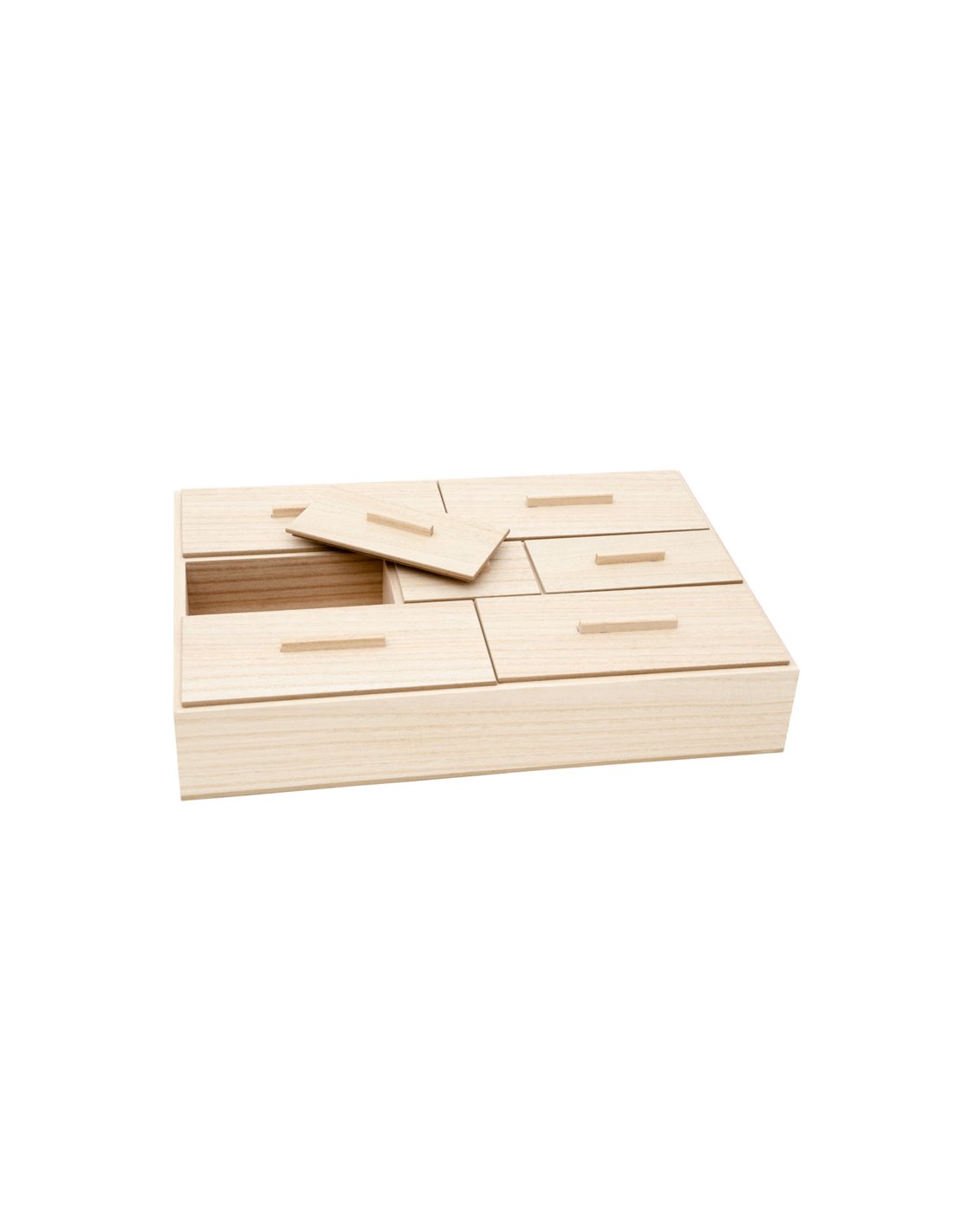 Esta caja de madera natural es ideal para organizar y almacenar todo tipo de pequeños objetos. Con 7 divisiones, cada una equipada con su propia tapa y pomo, es perfecta para guardar joyas, accesorios o incluso artículos de papelería. Su diseño práctico y elegante te permitirá mantener todo bien organizado y accesible.