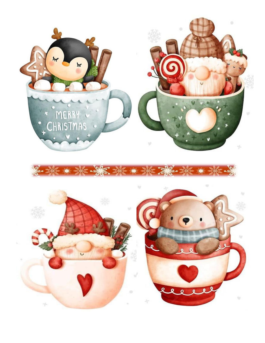 Esta lámina de papel de arroz trae a la cuadrilla más tierna de la Navidad, todos acurrucaditos dentro de sus tazas favoritas. Es la excusa perfecta para darle un upgrade de ternura a cualquier rincón de tu casa.