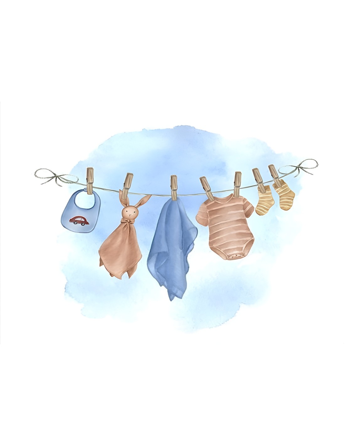 Te presentamos el Papel de Arroz Ropita de Bebé en la Cuerda, una lámina que te recuerda a esos días de sol suave y olor a limpio. Mira qué preciosidades están tendidas: un babero con un coche (¡para el futuro conductor!), un conejito de peluche (doudou) que parece de lino, un body rayado y unos patuquitos listos para calentar esos pies diminutos. Todo con un fondo de acuarela azul cielo que es pura paz.