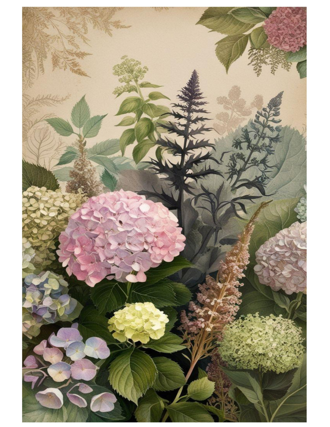 Papel de arroz en tamaño Din A4 con un exuberante jardín de hortensias en tonos pastel y verdes naturales. Perfecto para proyectos de decoupage con encanto floral y toques silvestres.